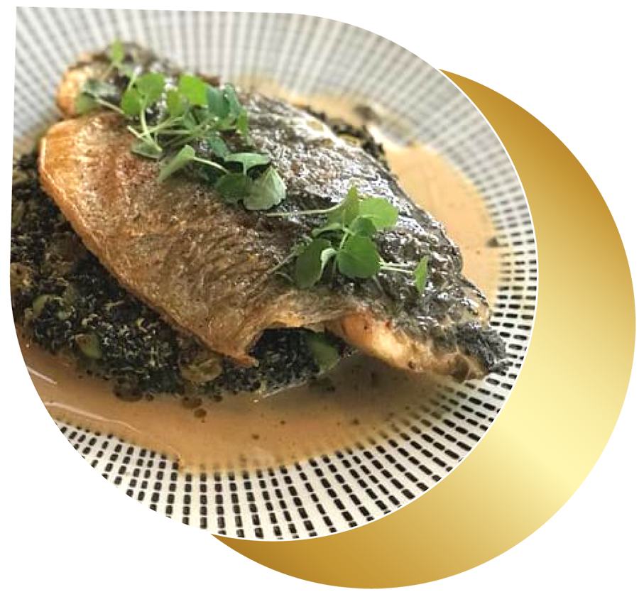 Filet de dorade à la plancha sur son lit de quinoa sauce aux algues et salade wakame.